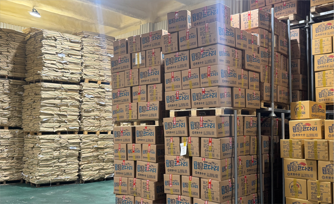분류하여 포장된 명태를 냉동하여 보관합니다.
